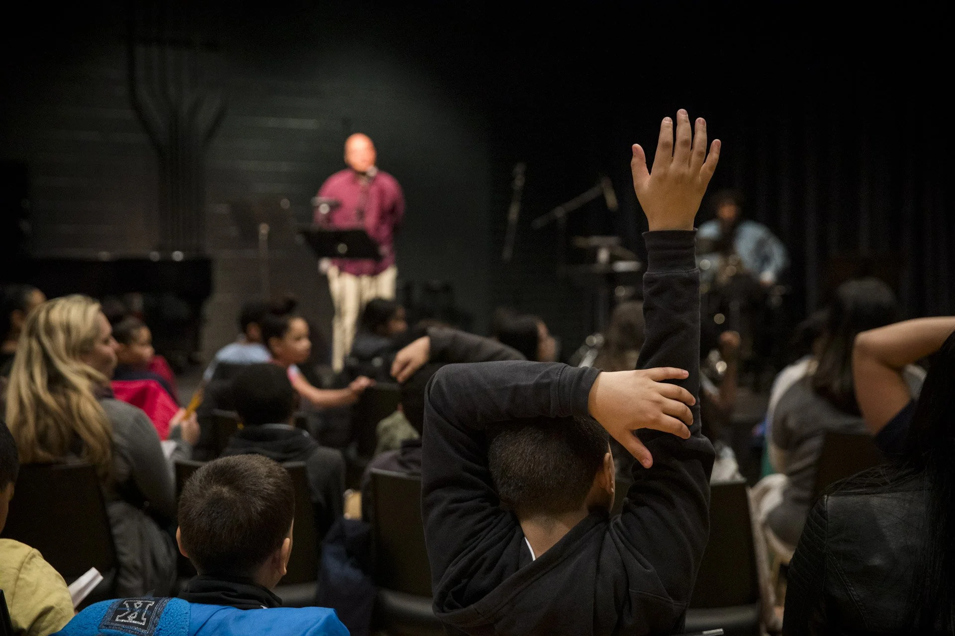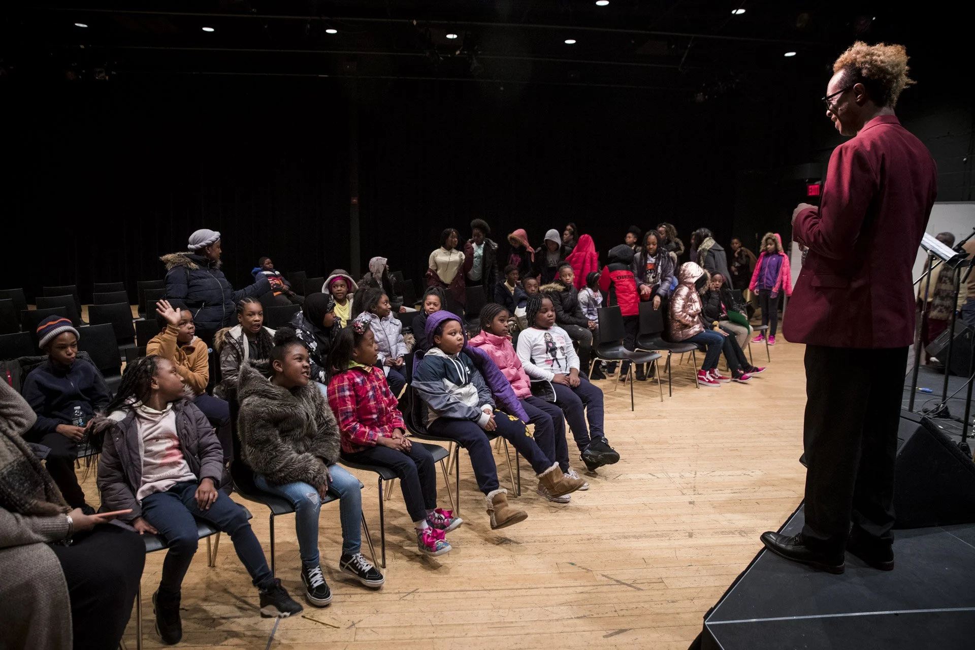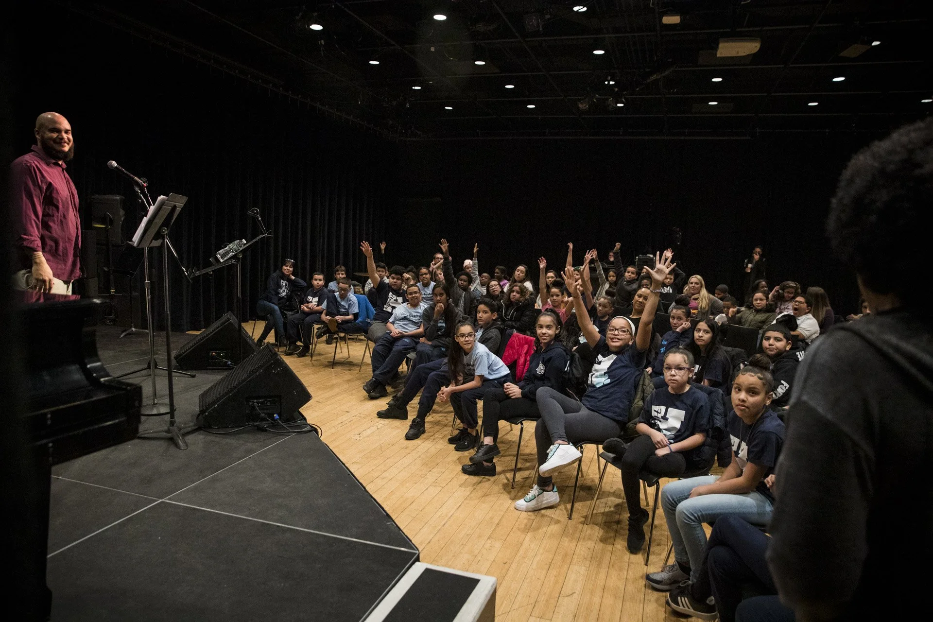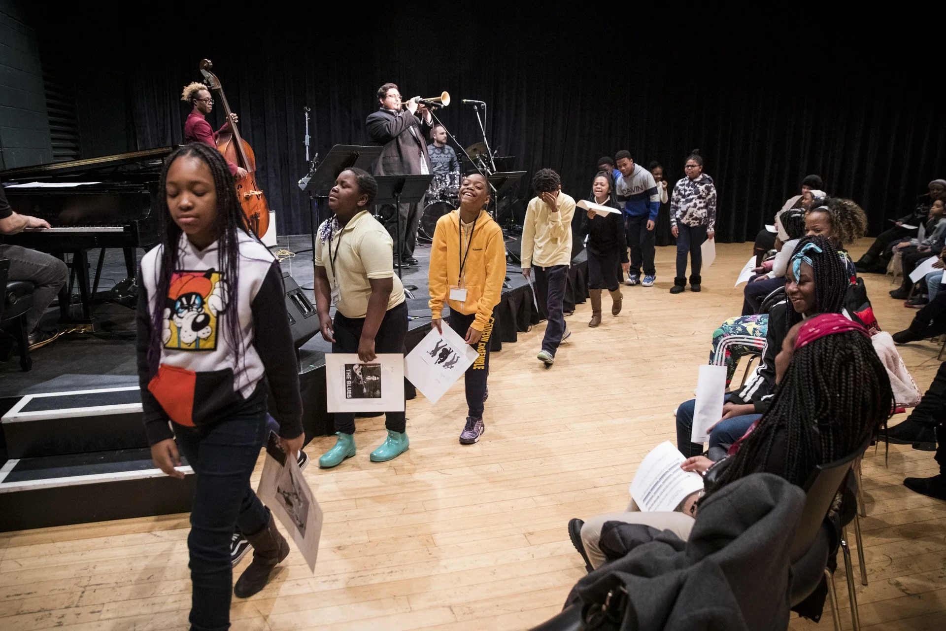 Students from a local school participate in a music workshop led by Charles “Chaz” Lattimore Howard part of the Jazz Residency at the Kimmel Center. Photo by Gustavo Garcia.