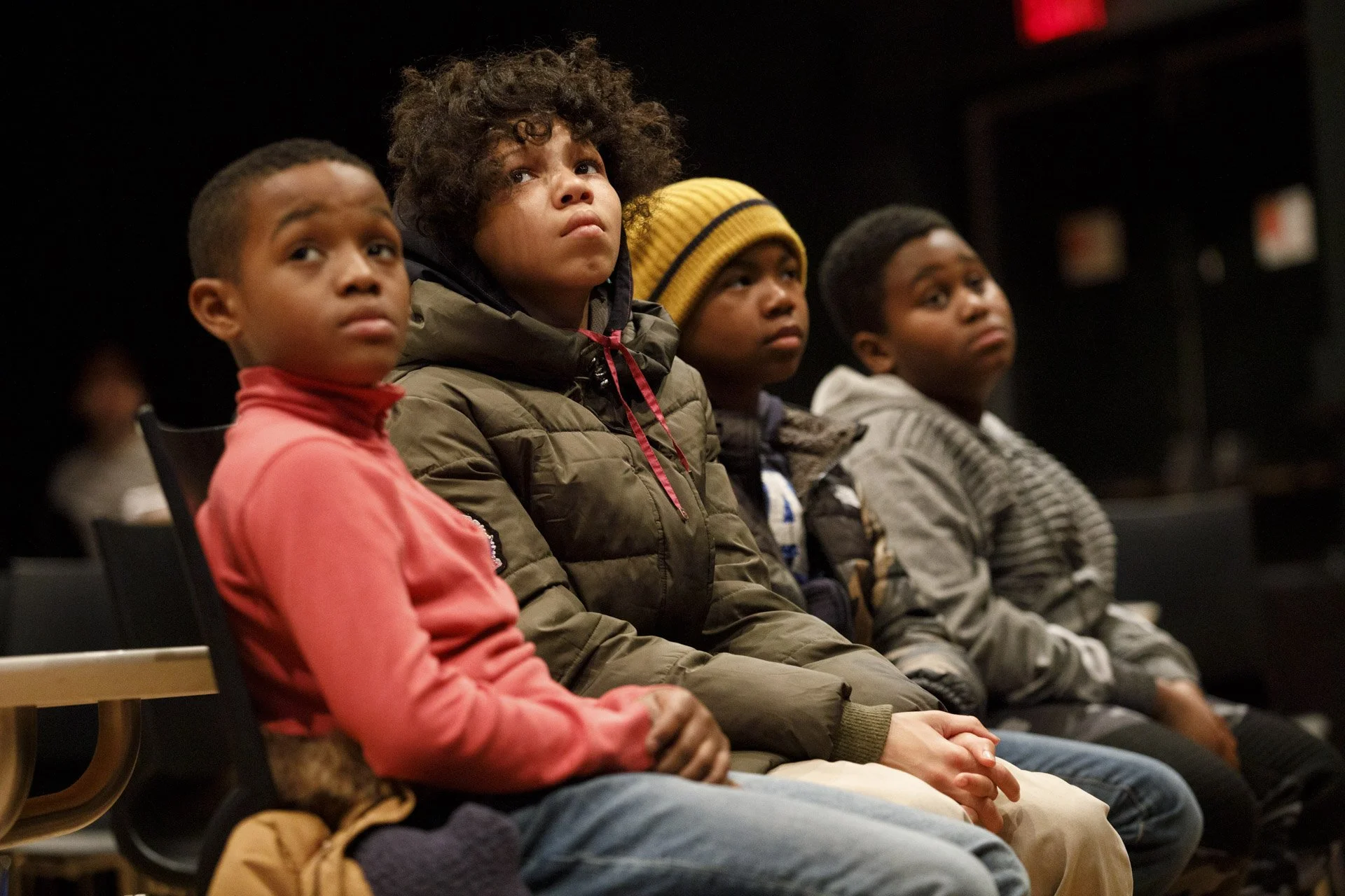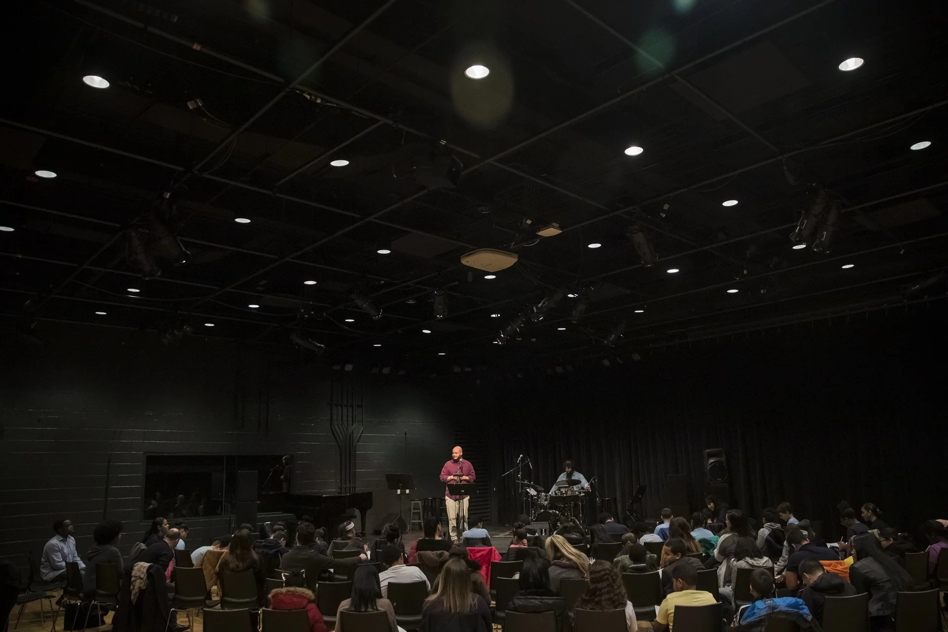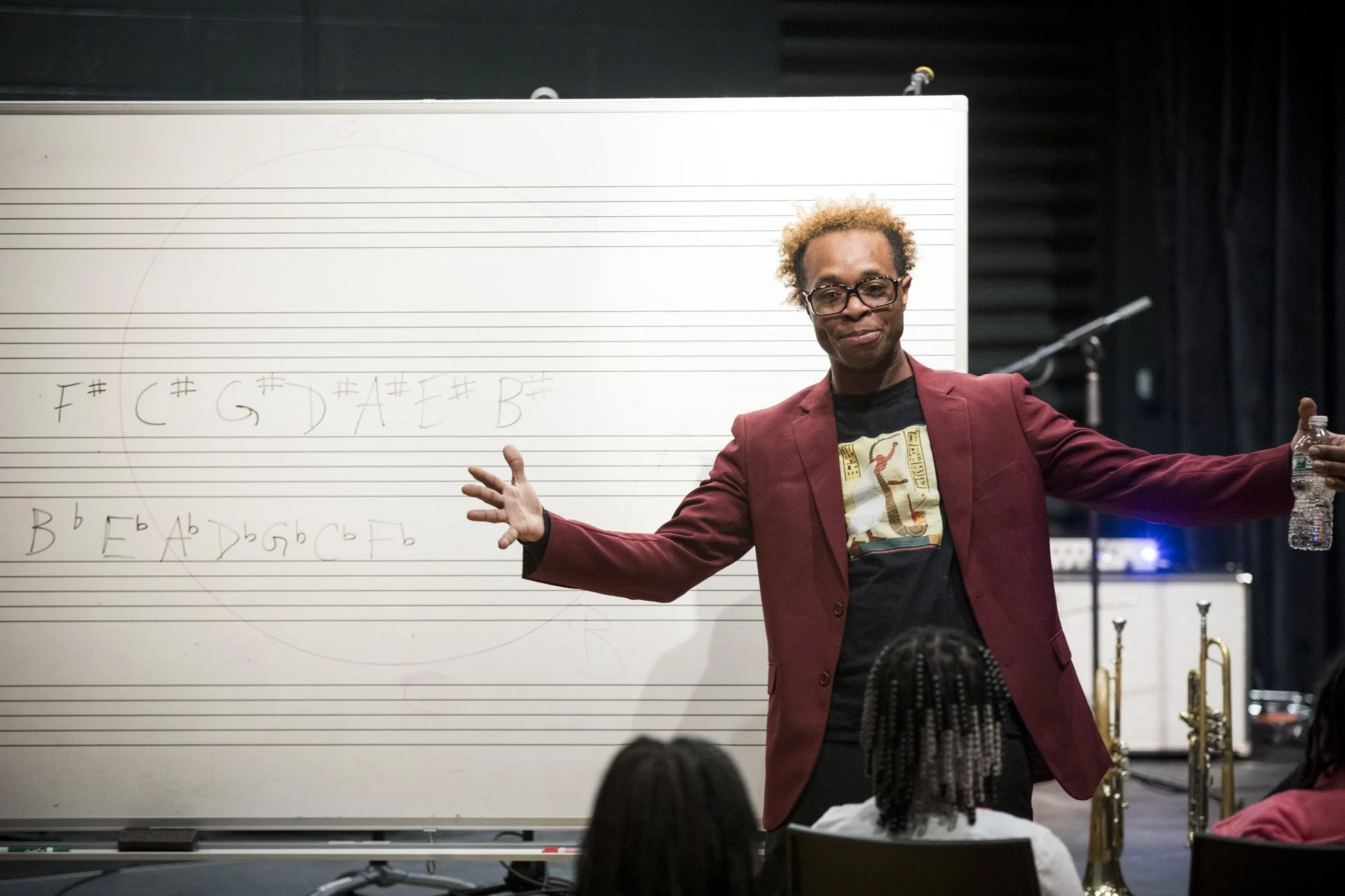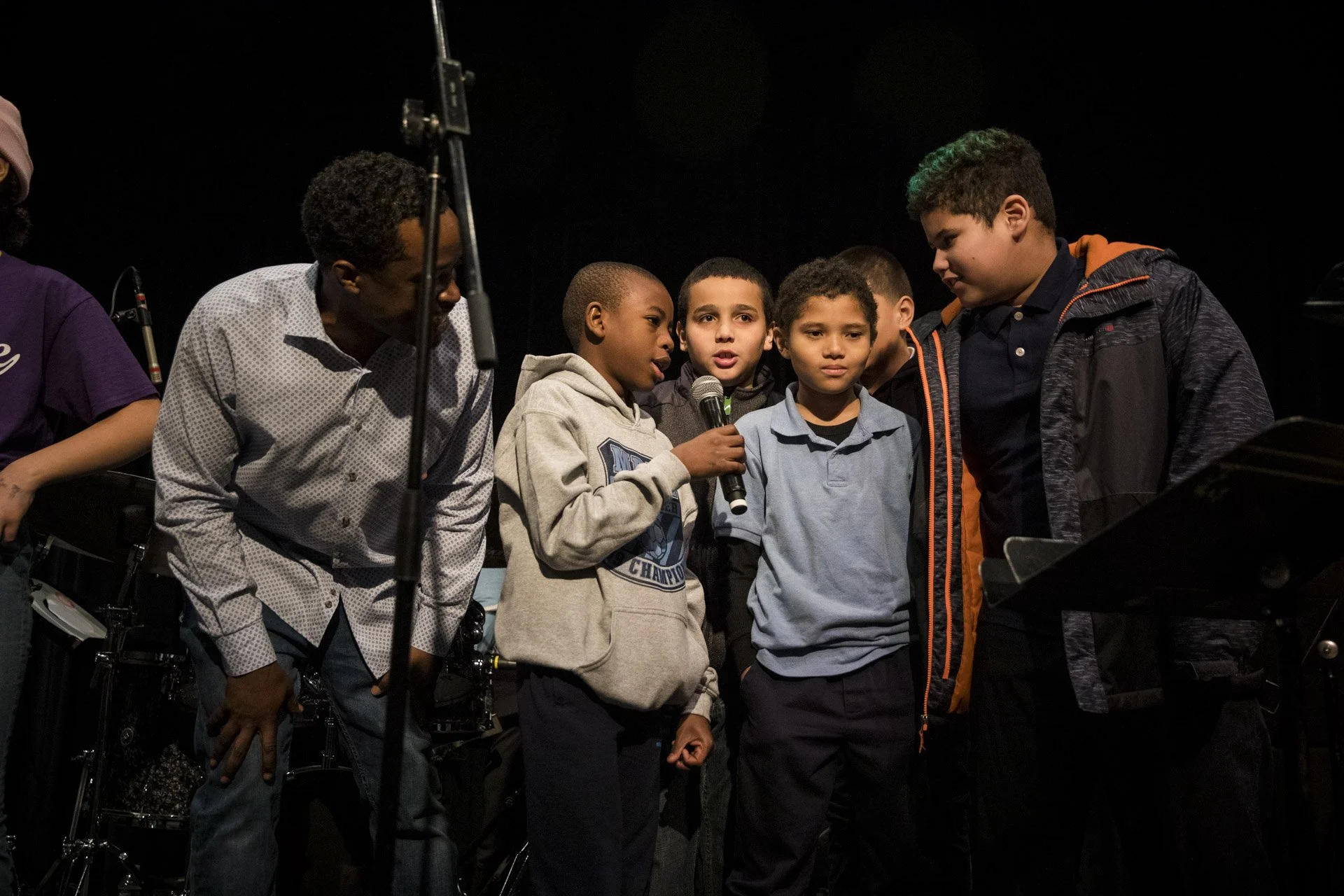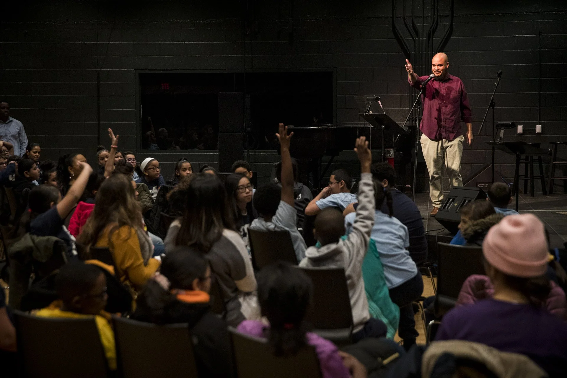 Students from a local school participate in a music workshop led by Charles “Chaz” Lattimore Howard part of the Jazz Residency at the Kimmel Center. Photo by Gustavo Garcia.